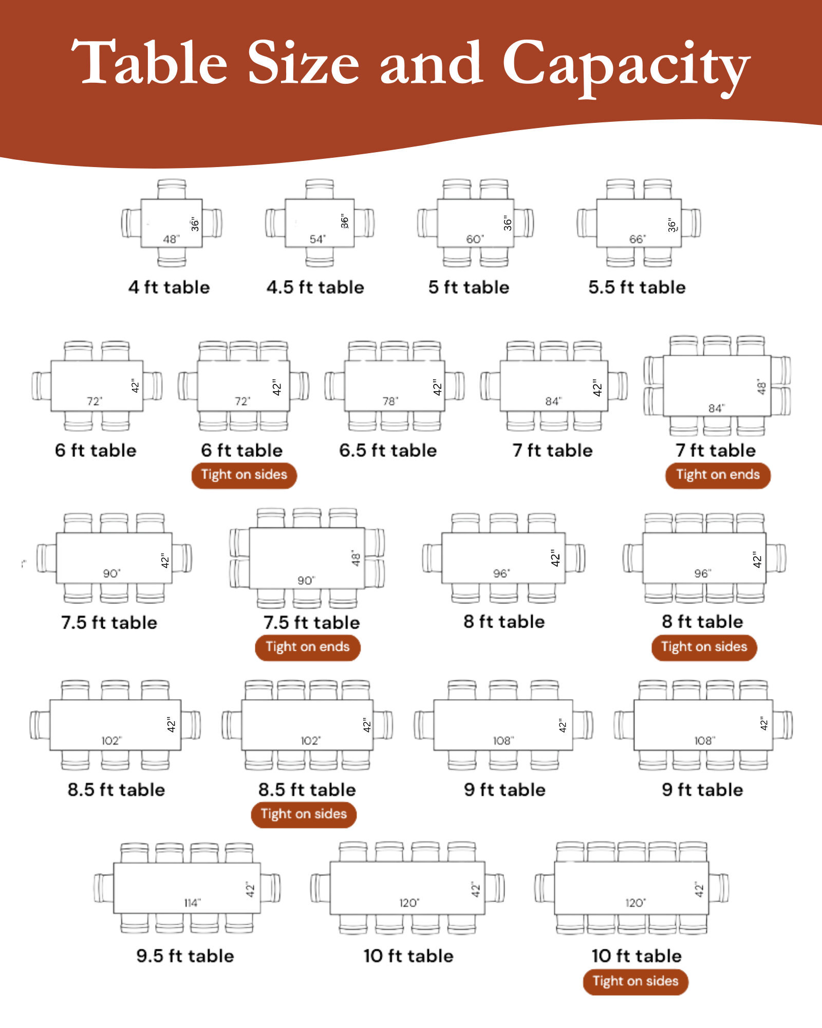 | 120" × 42–48" | 12 | 10 | For big gatherings and open plans. |
